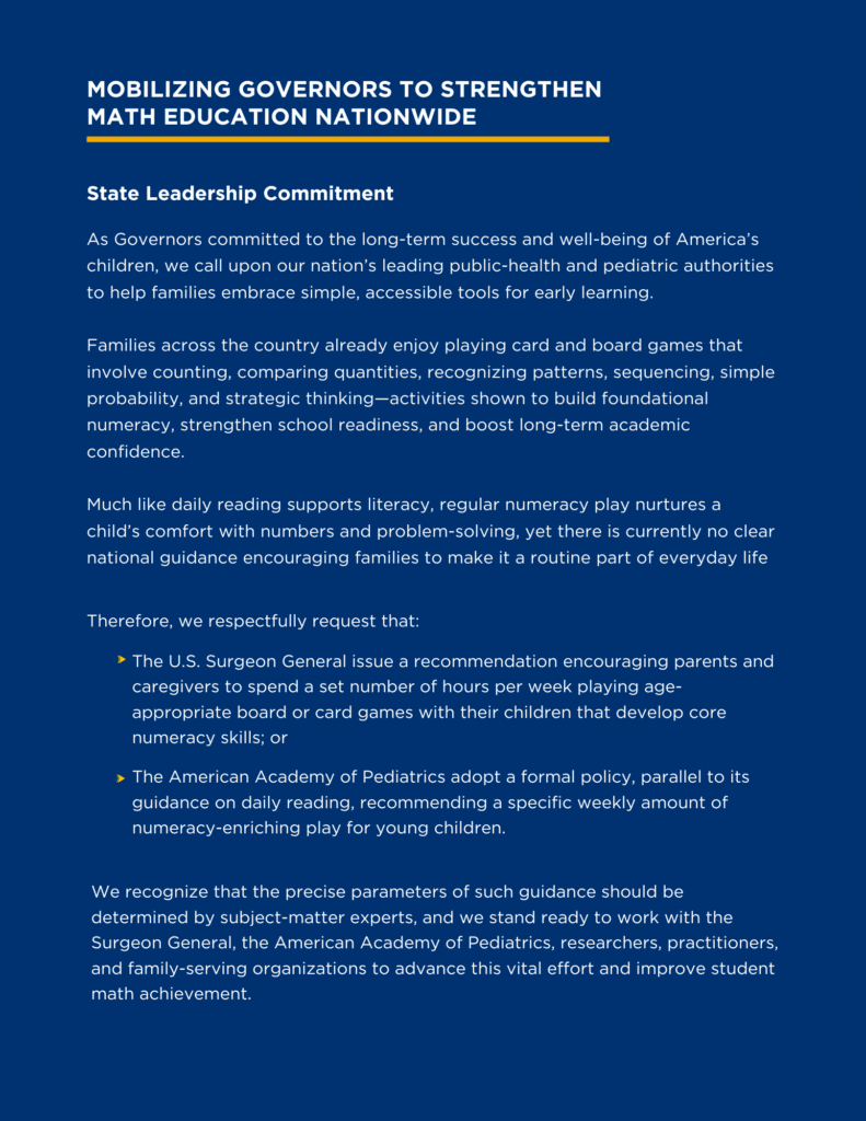 Governors are joining together to call on national public health and pediatric authorities to help families normalize numeracy-rich play in the early years. Just as pediatric guidance has helped institutionalize daily reading, similar guidance can elevate everyday math-building activities.