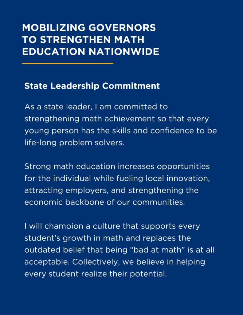 As chief executives of your states, governors are uniquely positioned to shift this narrative. Elevating math achievement strengthens workforce pipelines, fuels innovation, and signals that problem-solving is foundational to your state’s future prosperity.